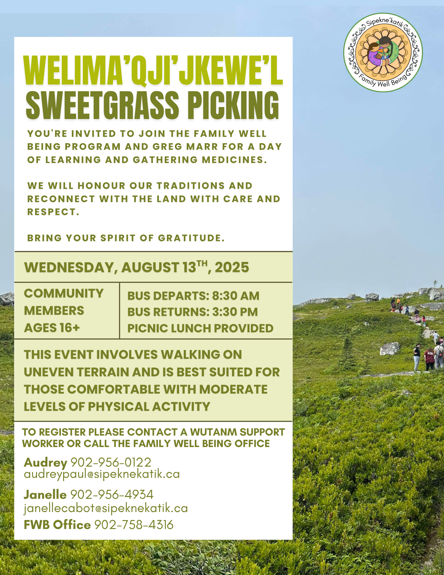 Buses will depart from the Sipekne’katik Community Centre at 9:00AM and return home to the Sipekne’katik Community Centre at 7:30PM.