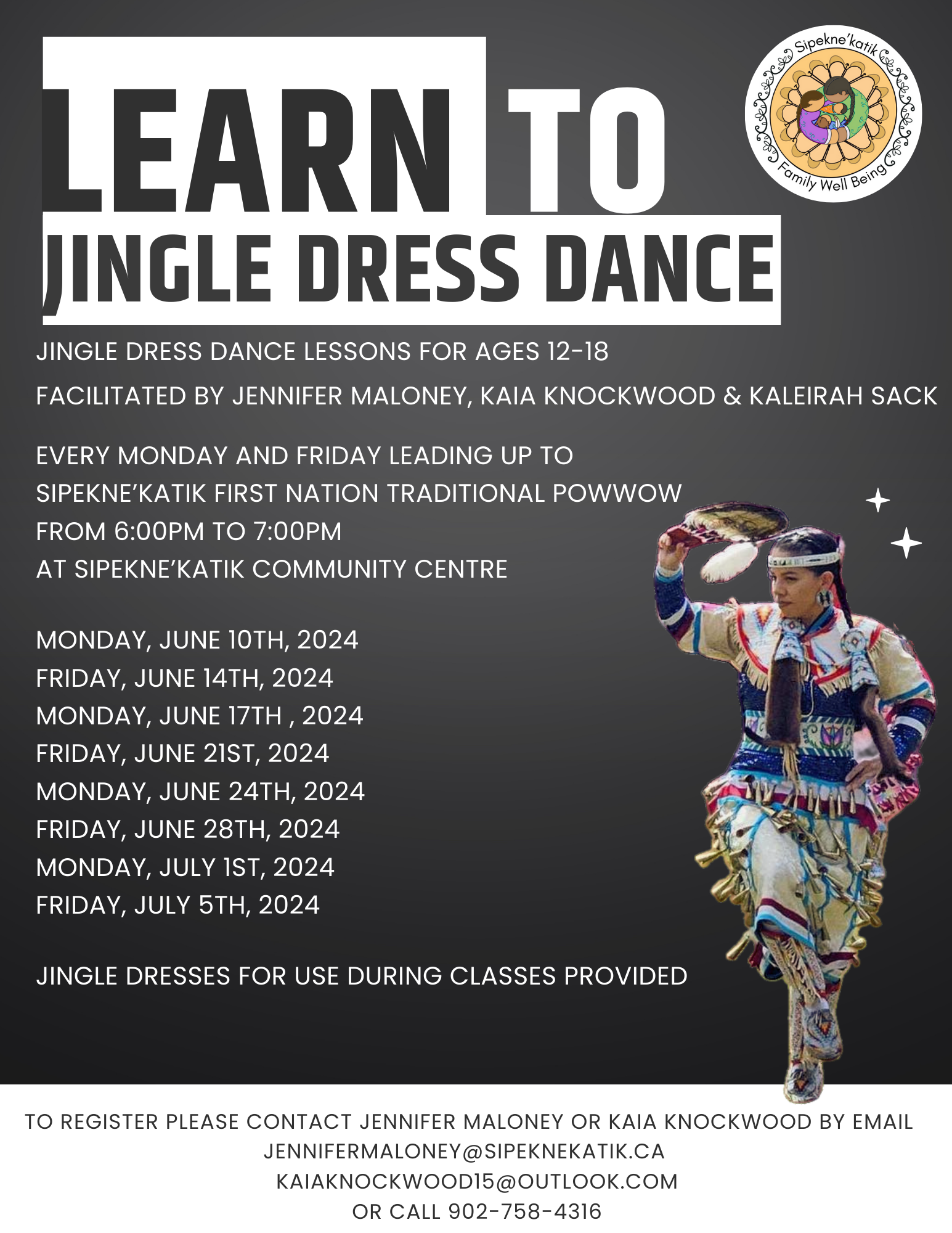 Jennifer Maloney and Kaia Knockwood from the Sipekne'katik Family Well Being Program will be hosting Jingle Dress Dance Lessons for youth ages 12-18 every Monday and Friday leading up to the Sipekne'katik First Nation Traditonal Powwow.