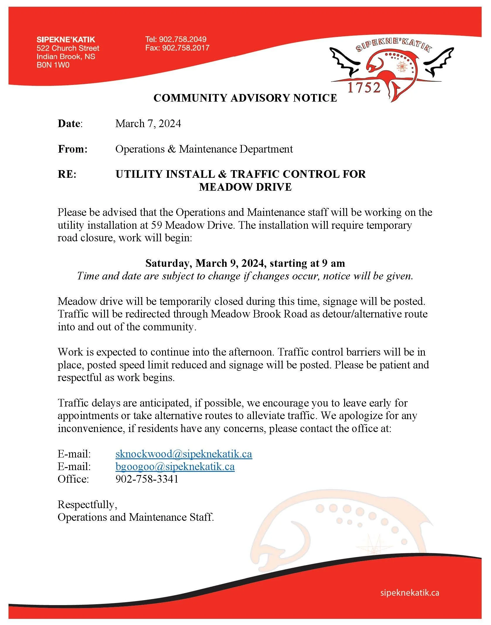 Community Advisory Notice - Utility Installation & Traffic Control on Meadow Drive on Saturday, March 9th, 2024 Mar 7 Written By Paige Mullin Paige Mullin